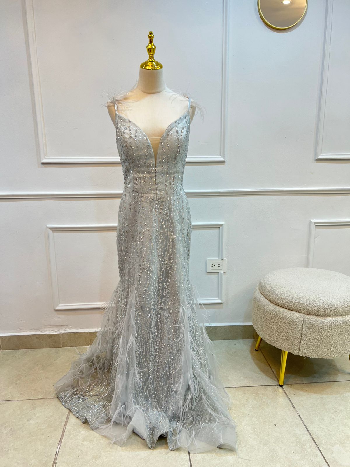 TIRANTE DE PLUMAS, ESCOTE V, ABERTURA EN P, CON PLUMAS GLITTER