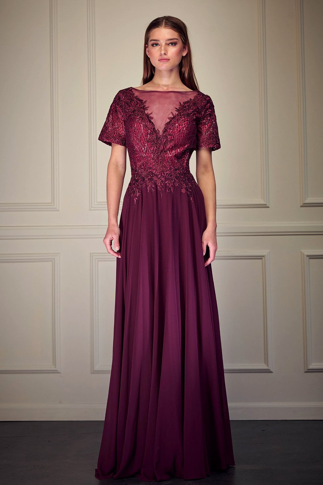 MANGA CORTA, TRANSPARENCIA EN ESCOTE, FALDA DE CHIFON