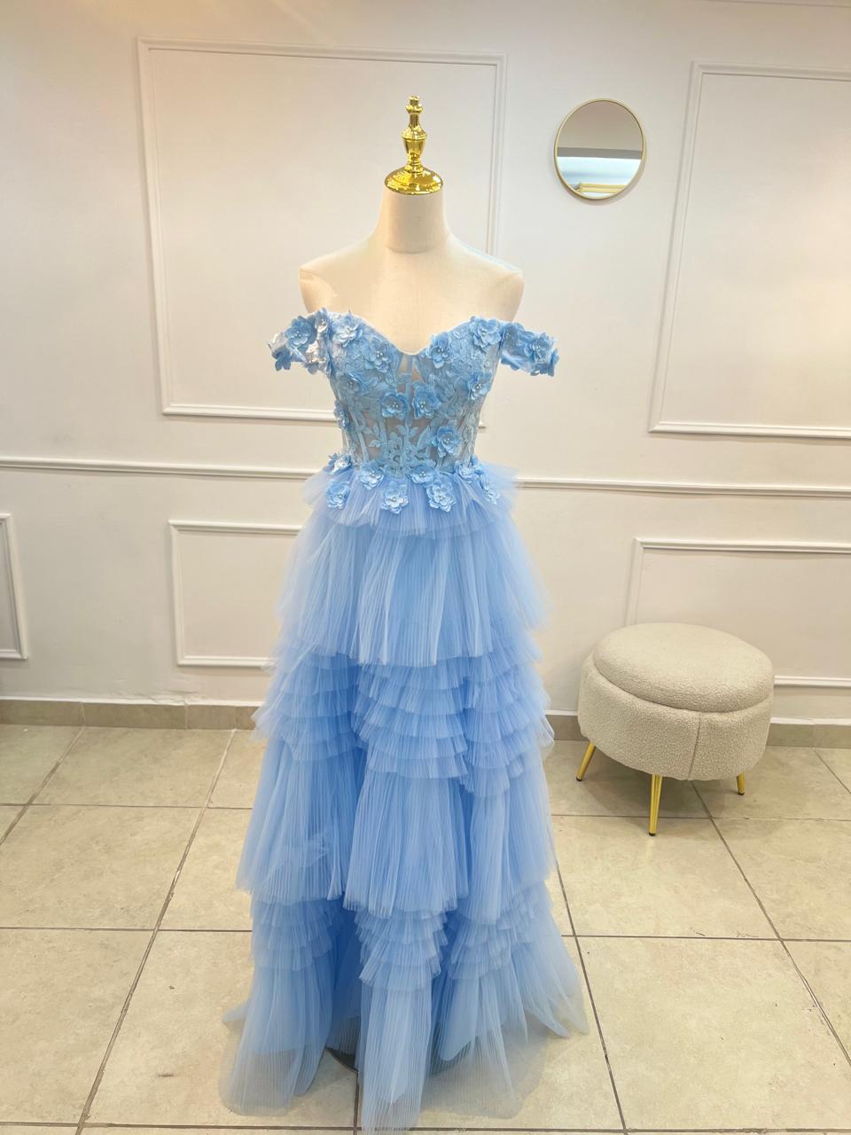 TIRANTE CAIDO, ESCOTE CORAZON, TIPO CORSET, FALDA DE OLANES