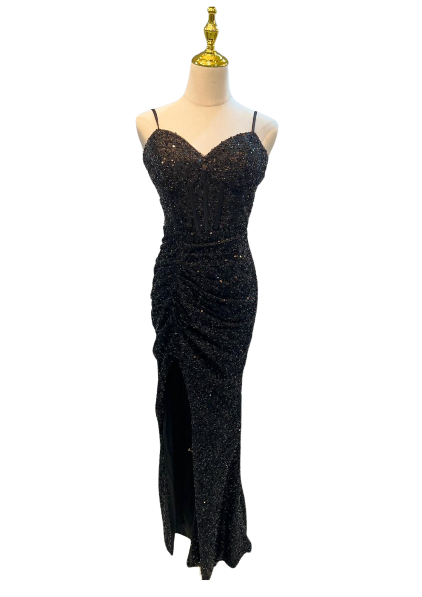 TIRANTES, ESCOTE CORAZON, TIPO CORSET, ABERTURA EN PIERNA, LENTEJUELA